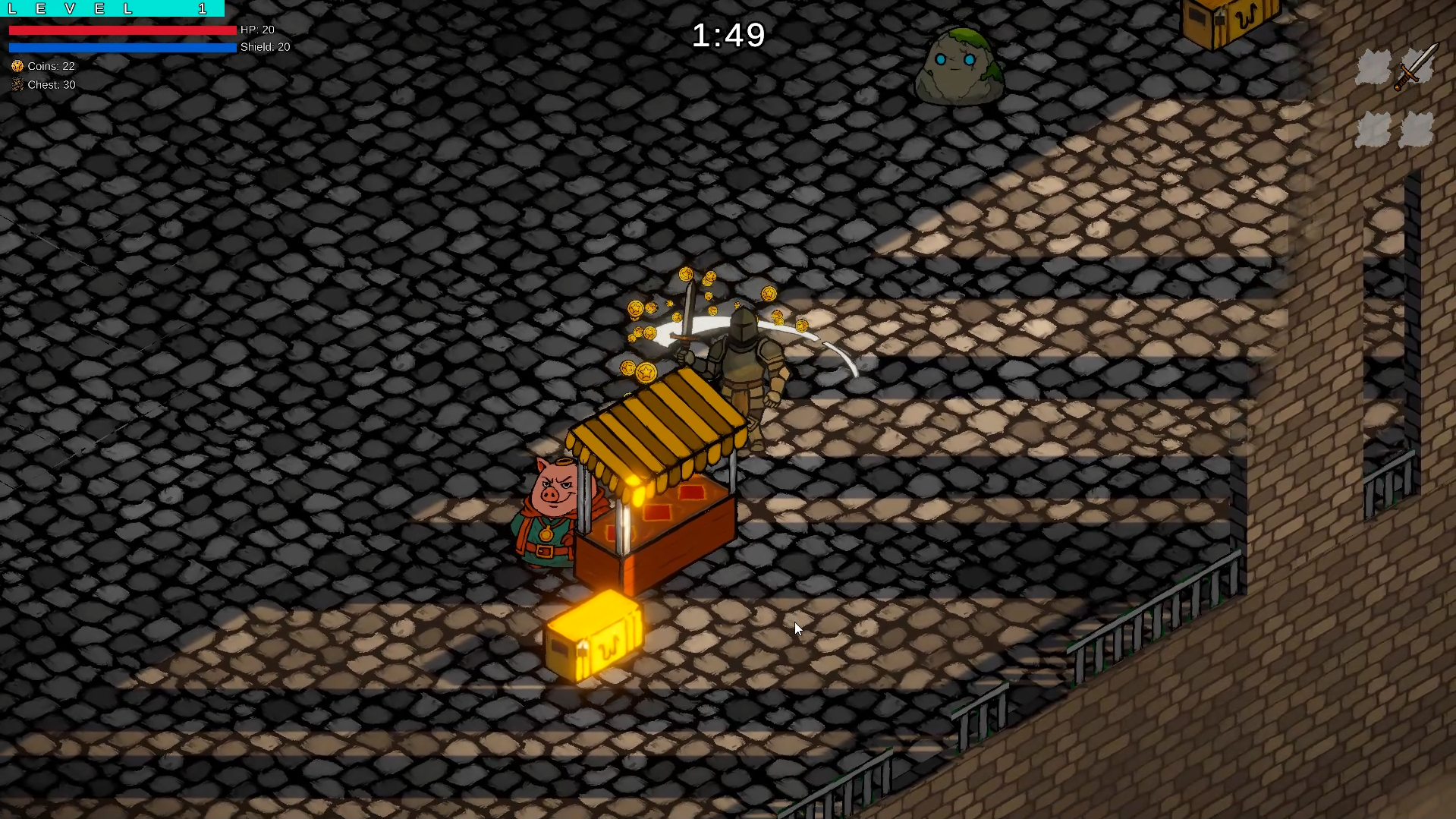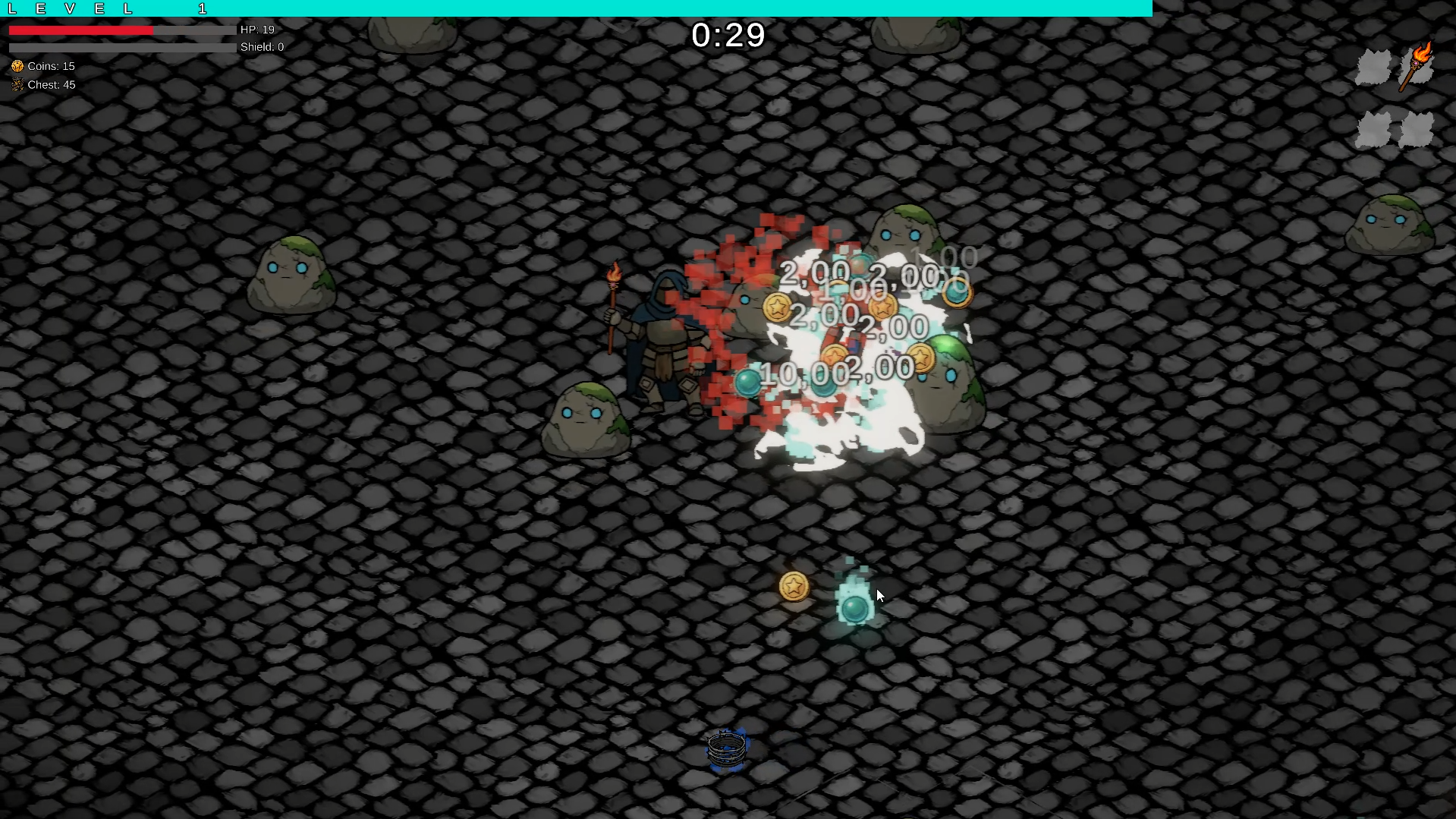 - Kill mobs and earn experience and coins from them. Experience is needed to unlock elevator doors to move up to the next level and receive additional bonuses for completing the level.